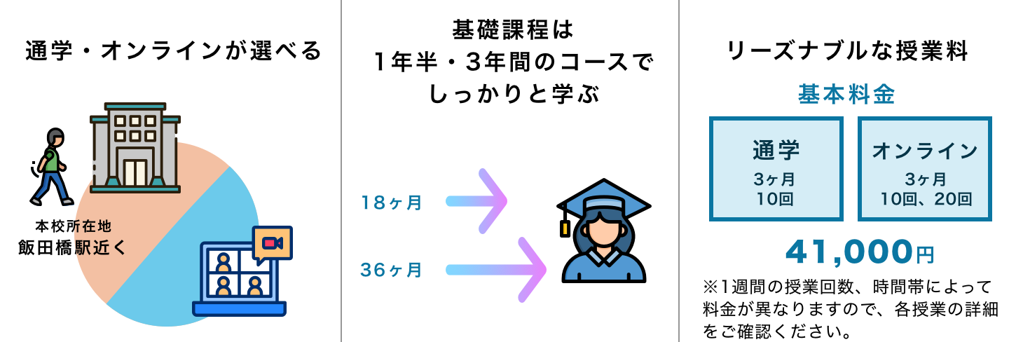 特に本校では、さまざまな講座の中から自分の目的に合ったものを選んで受講できるので皆さんの目的に合わせた柔軟な対応が可能です。