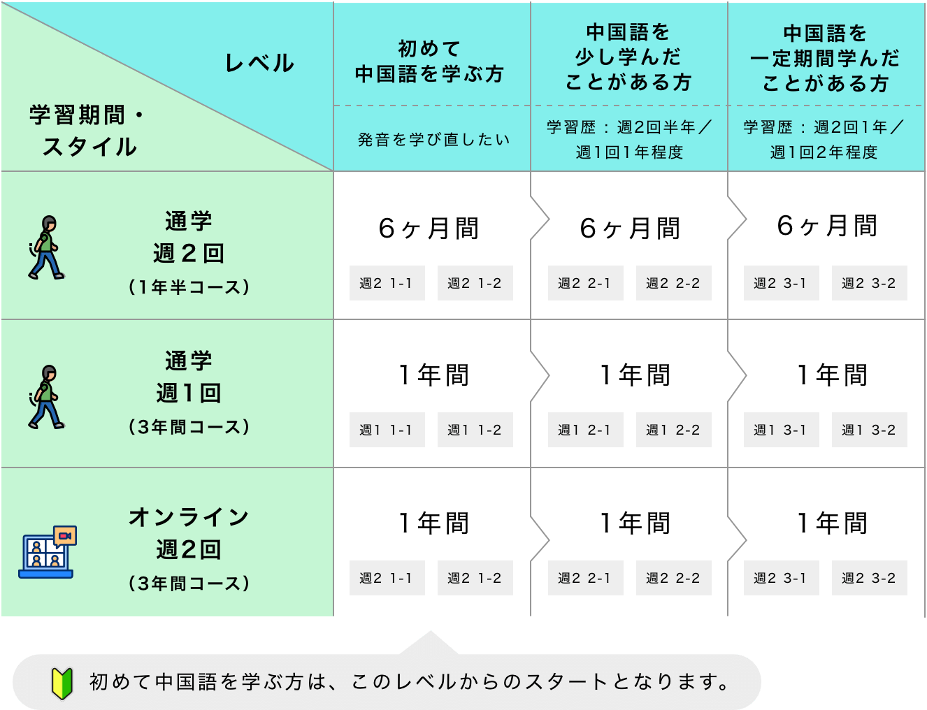 中国語レベルと、学習期間・スタイルに合わせて講座履修は下記のように分類されます。